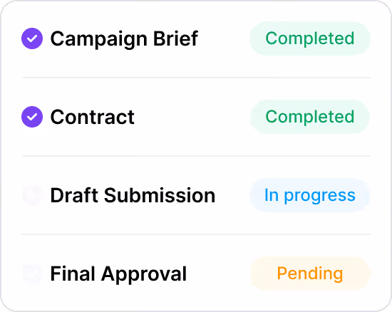 Lock in terms before you start, track deal progress clearly, and release payment automatically once content is approved without chasing or uncertainty.